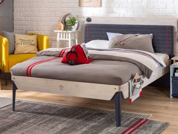 Το μεγάλο μοντέρνο παιδικό-εφηβικό κρεβάτι της σειράς TRIO είναι διακοσμημένο με το εντυπωσιακό μεγάλο υφασμάτινο μαξιλάρι με τις γκρι ρίγες και τα κόκκινα γαζιά στο κεφαλάρι του κρεβατιού. Το κρεβάτι διαθέτει πολλές εύχρηστες θήκες για μικροαντικείμενα που θα χρειαστεί ο κάθε έφηβος.